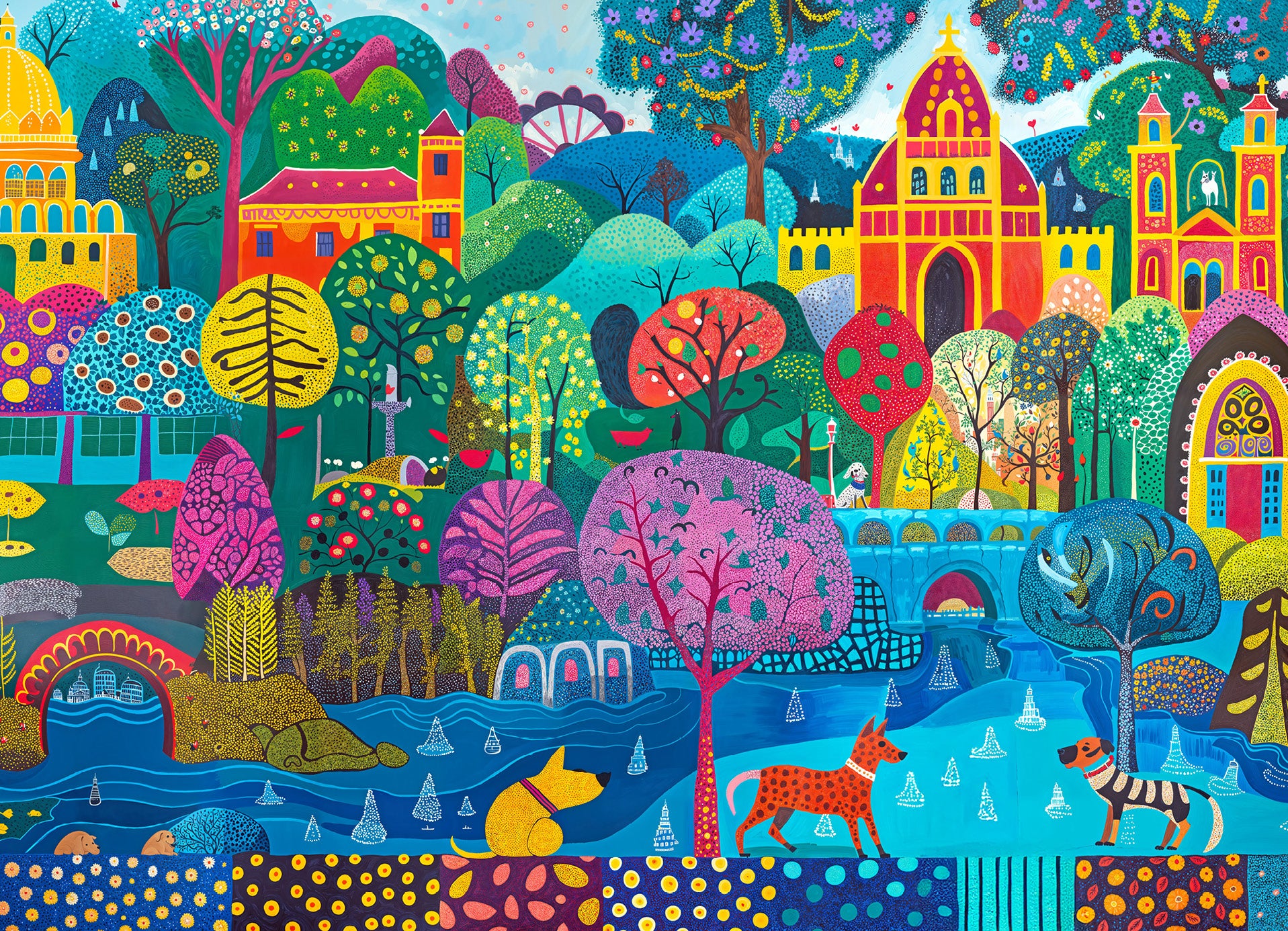 Step into a sun-drenched afternoon in Madrid’s El Retiro Park, where laughter echoes, fountains shimmer, and dogs rule the day. Dogs of El Retiro is a vibrant 1000 piece puzzle for adults that celebrates the playful heart of Spanish life. Each section reveals a new discovery—painted pups, strolling families, and the pure joy of color.