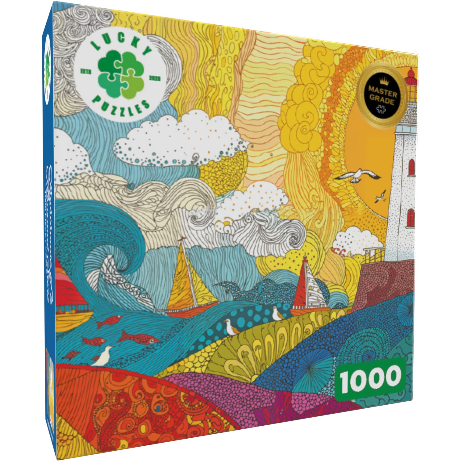 A Nautical Daydream in Every Piece - Unfold a radiant world of colour and whimsy with this 1000 piece jigsaw puzzle for adults. Lighthouse of a Thousand Suns transforms your table into a sunlit shoreline, where patterned waves crash, sailboats glide, and a bold lighthouse beams through the zentangle sky. It’s not just a puzzle—it’s an escape into vibrant serenity.